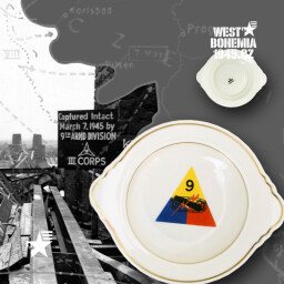 Po osvobození českého západu v dubnu a květnu 1945 mnoho amerických jednotek nepobylo na našem území příliš dlouho a často byly přemístěny do okupační zóny poválečného Německa. Souběžně s výhradně českými suvenýry a upomínkovými předměty 1945 mě zaujaly na mezinárodních aukcích eBay.com před lety i porcelánové popelníky, talířky a pivní korbely vyrobené v sousedním Bavorsku se znaky amerických pluků, praporů, divizí, sborů aj., které se podílely se na osvobození řady měst a obcí v západních a jihozápadních Čechách v dubnu a květnu 1945. Podařilo se mi získat celkem i unikátní kusy jako např. 12. skupinu armád generála Omara Bradleye, jednotky 1. a 90. pěší divize nebo 4. a 9. obrněné divize, nejsou to však zdaleka všechny a na některých najdete i název "CZECHOSLOVAKIA". Německo je proslulé tradiční výrobou "bílého zlata" dodnes a američtí vojáci po válce si kupovali na cestu domů mnoho těchto suvenýrů, často jako vzpomínku na jejich vojenskou okupační službu v Bavorsku 1945. Při bližším hledání se pak nejčastěji setkáte se značkami bavorských porcelánek jako např. "BAVARIA SCHUMANN" (WIESBADEN), "BAUSCHER WEIDEN", "P. T. TIRSCHENREUTH", "PMR JAEGER & CO GERMANY US ZONE", "THOMAS IVORY" a nebo také velmi známý a vyhledávaný "ROSENTHAL SELB-GERMANY".