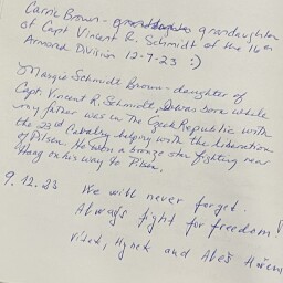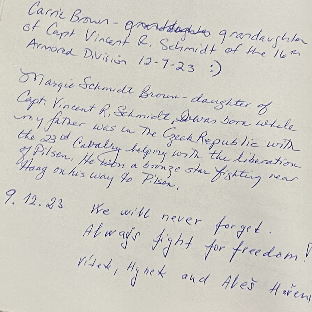Spací pytel, který byl privátně vyrobený pro kapitána Vincenta Raymonda Schmidta s armádním číslem O-374551 ze státu Massachusetts (19. srpna 1914 - 3. listopadu 1953), jsem získal darem od kamaráda Jirky Ledinského na počátku roku 2021 a ihned začalo bádání po americkém důstojníkovi, který spacák zanechal v Plzni u přátel, kteří pravděpodobně po válce emigrovali. S neuvěřitelnou shodou okolností se na konci roku 2021 podařilo Davidovi Foudovi vydražit na mezinárodní aukci eBay.com několik dek, odznaků a nášivka 16. obrněné divize z pozůstalosti kapitána Schmidta a zároveň získat kontakt na jeho dceru. Do hledání se zapoijla i Kathy Lemmons Hoffman z Asociace 16. obrněné divize, dcera osvoboditele západních Čech a vojenského policisty 16. obrněné divize Charlese Roberta Lemmonse, která s manželem každoročně navštěvuje Slavnosti svobody v Plzni. Před přidělením 16. obrněné divize k V. sboru a před jejím postupem na západočeskou metropoli Plzeň, se na přelomu dubna a května 1945 několik jednotek zúčastnilo bojů v okolí Wasserburgu. Na toto bavorské město cílila i 23. jízdní průzkumná eskadrona a v knize "The Liberators of Pilsen" (The U.S. 16th Armored Division in World War II) od Bryana J. Dickersona je zmíněn i komunikační důstojník 23. jízdní průzkumné eskadrony capt. Vincent R. Schmidt, který při postupu na nedaleký Haag vedl poddůstojníky k odvážnému útoku na německou kolonu se samohybnými děly ráže 88mm, při čemž nepřátele natolik zaskočil, že se rychle vzdali. Kapitán Schmidt následně zajal asi 400 německých vojáků a za záslužnou bojovou akci dne 2. května 1945 obdržel Bronzovou hvězdu od velitele 16. obrněné divize brigádního generála Johna L. Pierce. Příběh spacího pytle kapitána Schmidta však nekončí a počátkem prosince roku 2023 jeho dcera Margie s rodinou navštívila muzeum Patton Memorial Pilsen, památníky a místa v Plzni, kde se pohyboval její otec na základě fotografií a hlášení a vzpomínala tak na dobu, když její otec byl v Československu s 23. jízdní průzkumnou eskadronou a pomáhal s osvobozením města Plzně a západních Čech.