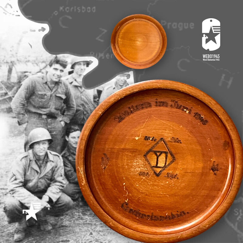 Téměř stejný suvenýr značený "Wallern im Juni 1945" ("Volary v červnu 1945") jsem prvně zahlédl v roce 2008 ve skvělém průvodci sběratele "Government Issue U. S. ARMY EUROPEAN THEATER OF OPERATIONS COLLECTOR GUIDE VOLUME II" od Henri-Paul Enjamese. Mnoho let vyhledávám podobné upomínkové předměty právě i se znakem americké 26. pěší divize z roku 1945. Tento talířek si přivezl z Čech americký voják, který sloužil ve Volarech u 101. pěšího pluku 26. pěší divize a jejíž přezdívka ˇYankee Divisionˇ pochází od vzniku jednotky v roce 1917 a začlenění do bojů v 1. světové válce. Město Volary (německy Wallern) leží v jihozápadní části Jihočeského kraje, kde se nachází památník připomínající smrt téměř stovky žen, které zemřeli v závěru války při tzv. "Pochodu smrti" na cestě z koncentračního tábora v Ravensbrücku a Helmbrechtsu. V těsné blízkosti Volar v místě zvaném Stögrova Huť se nachází památník věnovaný poslednímu padlému americkému vojákovi s českými kořeny Pfc. Charlesi Havlatovi (803rd Tank Destroyer Battalion), který padl v posledních hodinách 2. světové války dne 7. května 1945. Dřevěný talířek se mi podařilo získat koncem srpna 2025 ve facebookové skupině "US Military Collectibles "Make Offer" Page", kde naleznete k prodeji řadu nejrůznějších militarií a kde můžete učinit svoji cenovou nabídku u vystavených předmětů a zároveň podpořit jiného sběratele nebo i neziskovou organizaci jako např. v tomto případě "Honored Legacy Project" z New Jersey. Děkuji Adamu MacMillanovi za umožnění koupě a poslání suvenýru zpět do Čech po 80 letech od konce války.