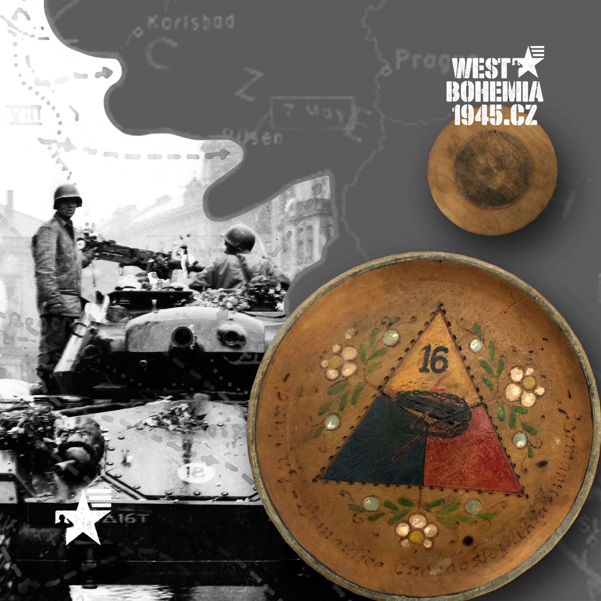 Dřevěný talířek s nápisy "England", "Germany", "Domažlice Czechoslovakia" a znakem 16. obrněné divize, jedné z nejmladších amerických obrněných divizí sestavených v letech 2. světové války v červenci 1943 v Camp Chaffee v Arkansasu, jsem získal od známého sběratele US rukávových nášivek na podzim roku 2014. Tento suvenýr jsem viděl u Jirky Vaňka před více než 20ti lety na zdi a je jedním z mála, který se u nás vůbec dochoval a necestoval s americkým vojákem do zámoří jako většina podobných upomínkových předmětů vyrobených v západních a jihozápadních Čechách v roce 1945. S přezdívkou "Armadillo" (pásovec) se 16. obrněná divize pod vedením brigádního generála Johna L. Pierce dostala na evropské bojiště až v lednu 1945, po vylodění v Le Havru se zapojila do bojů, překročila řeku Issar a postupovala na Wasserburg, kde útokem obsadila několik malých měst. Cvičila a vykonávala pak strážní službu v Norimberku a dne 5. května 1945 zahájila cestu na Plzeň. Následující den Plzeňané přivítali po 8. hodině ranní muže plukovníka Charlese H. Noblea, velitele bojového uskupení B, následující jednotky divize a jejich příslušníky, kteří bezesporu pomohli občanům a městu se stát opět svobodným po šestileté nacistické nadvládě. Dodnes si město Plzeň 6. květen 1945 a konec 2. světové války v Evropě připomíná během květnových Slavností svobody a každoročně a společně se vzácnými hosty, veterány a jejich rodinami.především vzpomínkovým aktem u památníku "Díky, Ameriko!" a na dalších pamětních místech.