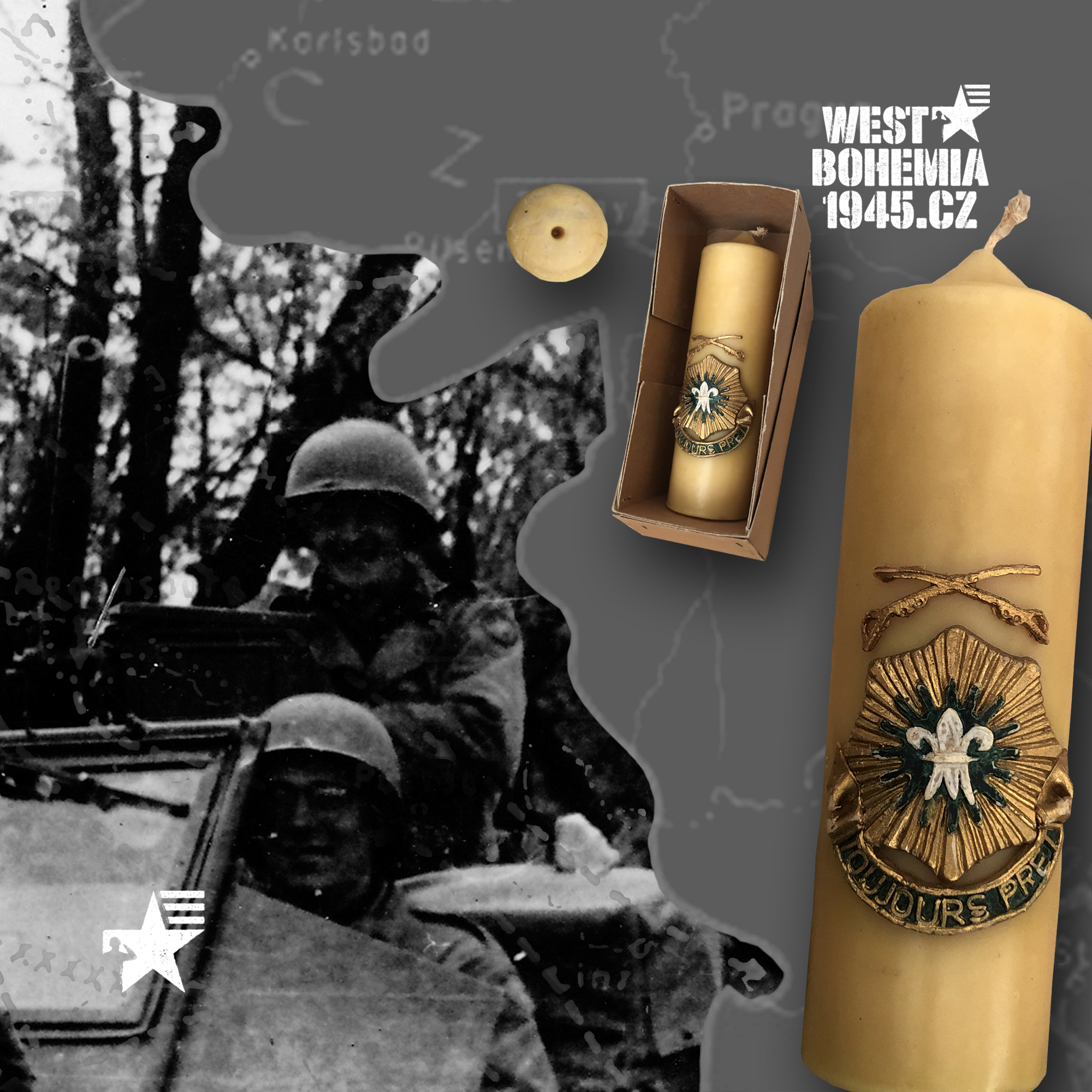 Po skončení války v Evropě se vyráběly upomínkové předměty nejen v Čechách, ale i v dalších osvobozených zemích, kde se snažili obyvatelé vyjádřit vděčnost svým osvoboditelům převážně vlastními výrobky. Tento suvenýr v podobě masivní stolní svíčky byl vyroben ve Francii roku 1944 a podařil se mi vydražit v roce 2015 na mezinárodní aukci eBay.com. Na papírové krabici je poznámka "2 SQUADRON CANDLE" a znaky připomínají slavnou americkou 2. kavalérii s mottem "TOUJOURS PRET" ("Vždy připraven"), jejíž historie a tradice sahají až do roku 1836. Pod kavalerií si představíme spíš jezdectvo na koních, které bylo možné vidět ještě počátkem 30. let 20. století, avšak v meziválečném období došlo k postupné motorizaci a reorganizaci pozemních sil americké armády. Jízdní průzkumné mechanizované skupiny a jejich eskadrony vybavené moderní vojenskou technikou se pak osvědčily na bojištích 2. světové války jako velmi úspěšné a byly často používány k rozsáhlým průzkumným akcím nebo i k únosům zajatců za nepřátelskými liniemi. Oproti jiným útvarům měla na evropském bojišti 2. jízdní mechanizovaná skupina, složená z 2. a 42. jízdní skvadrony, minimální ztráty a to díky taktice jejího velitele plukovníka Charlese Hanckocka Reeda, který např. pomocí falešných radiových zpráv zmátl nepřítele natolik, že se kavaleristům u Němců dostalo přezdívky "GHOSTS OF PATTON´S ARMY" („Duchové Pattonovy armády“). "2. jízdní" se podařilo osvobodit první československé město na západě Aš, její 42. jízdní průzkumné skvadroně naplánovat a provést slavnou "Operaci Cowboy", během níž vojáci osvobodili chovné stádo lipicánského koně v Hostouni a spojenecký tábor válečných zajatců, dosáhnout nejvzdálenějšího průniku na východ ze všech amerických sil a krátce se ubytovat v závěru války na zámku v Žinkovech.