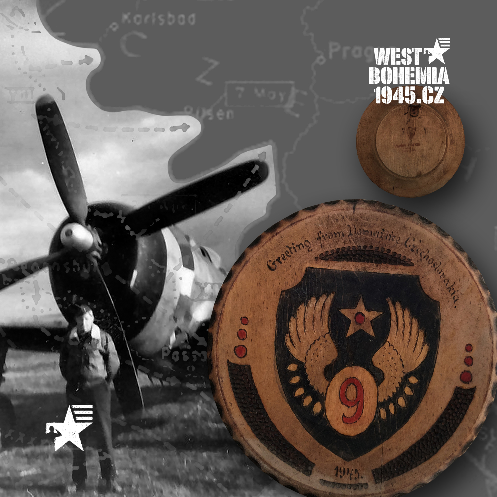 Tento skvělý dřevěný suvenýr a zároveň pozdrav z Domažlic z "pětačtyřicátého" roku, s nápisy "Greeting from Domažlice. Czechoslovakia. 1945." a zdobený znakem americké 9. letecké armády, jejíž jednotky bojovaly v Africe již v listopadu 1942, při vylodění Spojeneckých vojsk v Normandii v červnu 1944 nebo prováděly nad naším územím v závěru války kromě hloubkových útoků na lokomotivy a vojenské cíle i podporu pozemním jednotkám 3. americké armády generála George S. Pattona, se mi podařilo získat v internetové mezinárodní aukci eBay.com v říjnu roku 2017. Ojedinělý dřevěný a upomínkový talířek s pozdravem z města Domažlice, z tradičního centra Chodska, které se nachází 55 kilometrů jihozápadně od Plzně a 15 kilometrů od německých hranic, byl vyroben chodským řezbářem a malířem Václavem Hůrkou v Domažlicích (5. června 1873 - 12. prosince 1950), který maloval drobné řezby v kostelích, vyřezával a vypaloval ozdobné a nejrůznější upomínkové předměty a je autorem řady podobizen, figurálních výjevů či krajin. Od stejného autora je podobně vyroben i talířek 2. pěší divize (viz "Indianhead" v Domažlicích). Je velice pravděpodobné, že byl vyroben již tehdy na zakázku v souvislosti se stále živou vzpomínkou na stíhacího letce Thunderboltu P-47D Virgila Paula Kirkhama, příslušníka 377. stíhací letky 362. stíhací skupiny 9. letecké armády, který zahynul 30. dubna 1945 v Zadní Hoře mezi obcemi Újezd a Trhanov nedaleko Domažlic.