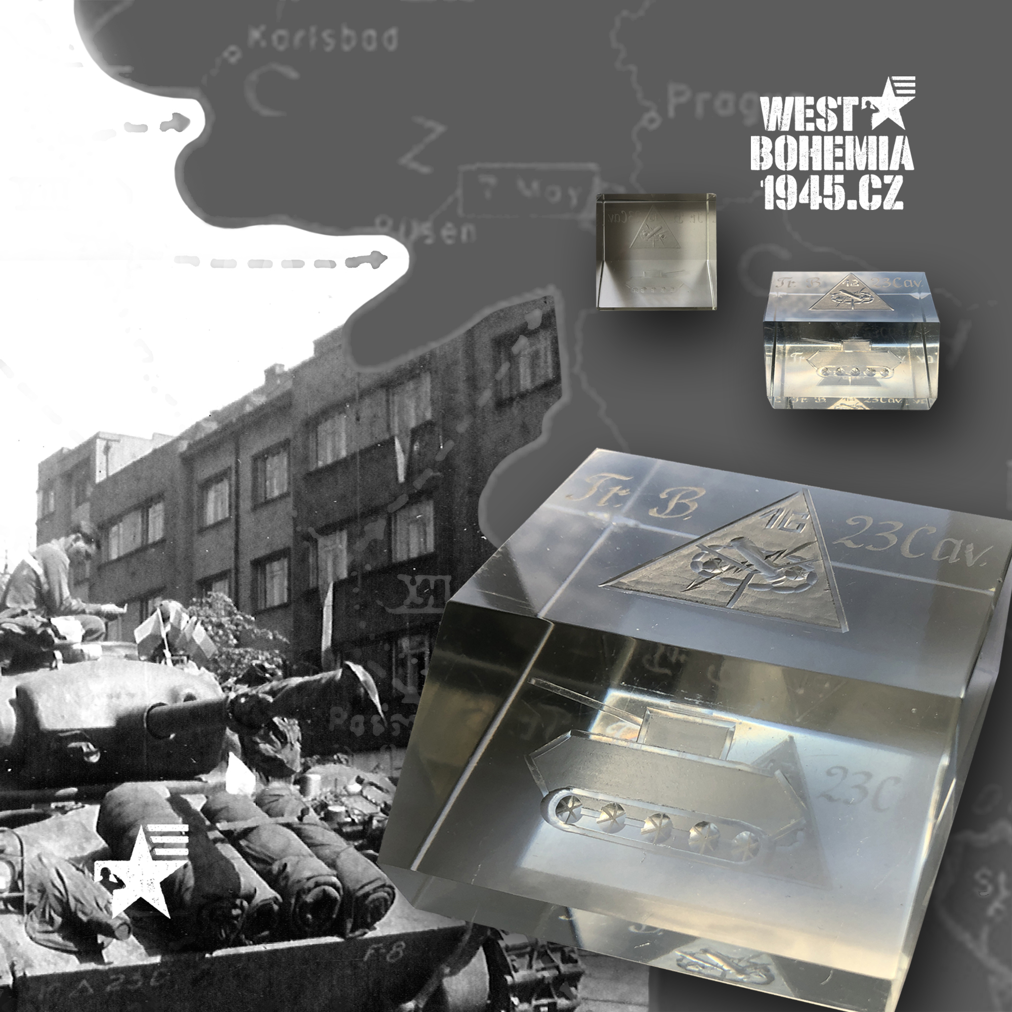 Při soustavném vyhledávání upomínkových předmětů z roku 1945 mě před pár lety zaujaly skleněné optické hranoly, které původně poskytovaly panoramatický výhled německým pancéřovým vozidlům a na které si američtí vojáci po skončení bojů v Evropě nechávali vybrousit znaky svých jednotek, jako co jsem například viděl znak "Rainbow" 42. pěší divize nebo "Thunderbolt" 83. pěší divize. Ačkoliv hospodářská krize ve 30. letech nepřála českému sklářskému průmyslu a docházelo k uzavření menších závodů či omezování výroby před válkou, tak za Protektorátu Čechy a Morava několik sklářských firem na Liberecku, Jablonecku, Železnobrodsku nebo Borskošenovsku vyrábělo pro Třetí říši tvrzená a optická skla pro použití ve vojenských dalekohledech, periskopech apod. Nikdy by mi však nenapadlo, že v prosinci 2021 objevím na mezinárodní aukci eBay.com tento parádní "kořistní optický hranol", který byl během války pravděpodobně vyroben ve "městě skla" v Kamenickém Šenově, kde průzory do obrněné německé techniky z optického skla vyráběla šenovská sklárna Adolfa Rückla z roku 1886 (dnešní Severosklo) a na kterém je vybroušený znak 16. obrněné divize "osvoboditelky města Plzně" včetně označení jejího průzkumného oddílu "Troop B" 23. jízdní průzkumné eskadrony a siluety lehkého tanku M24 Chaffee.