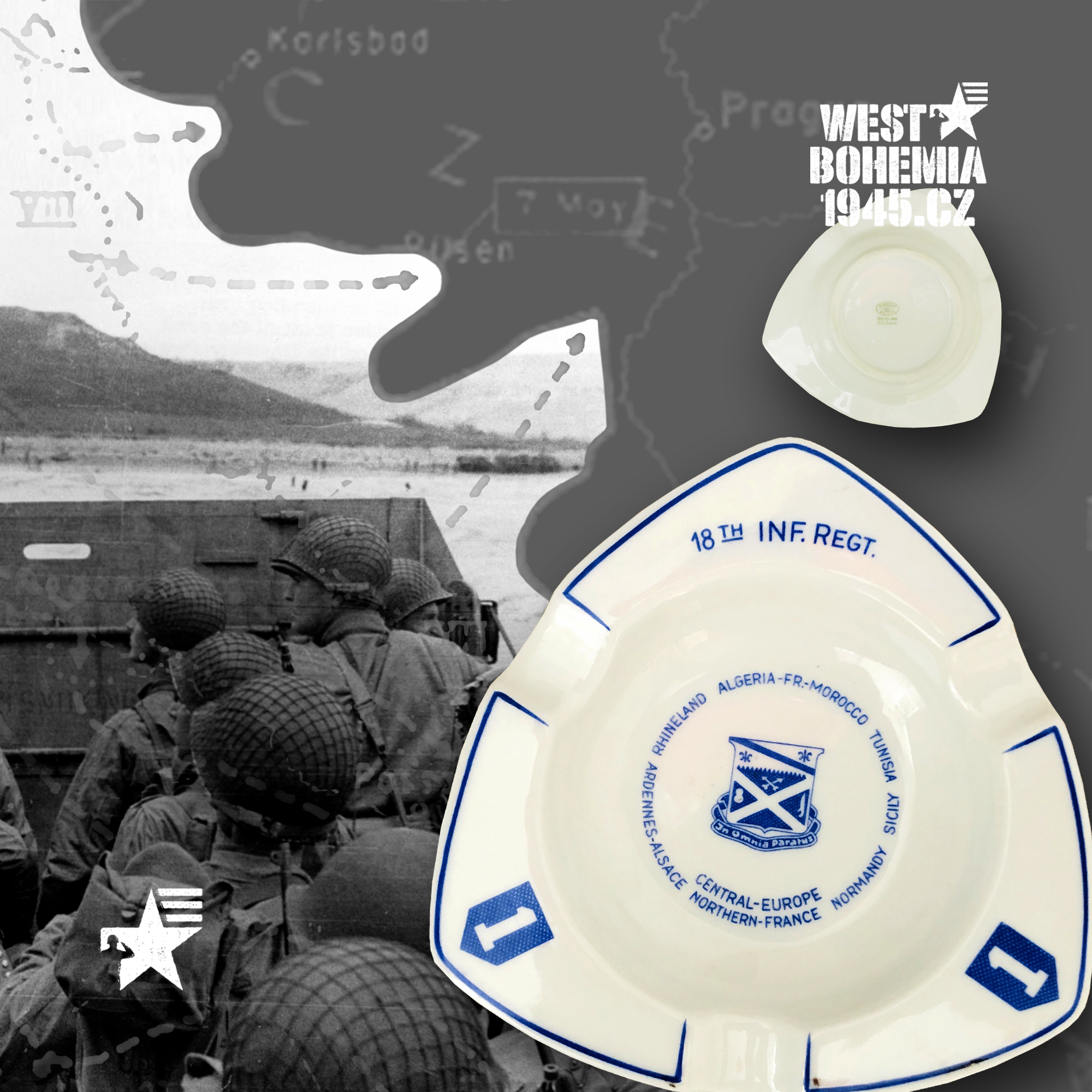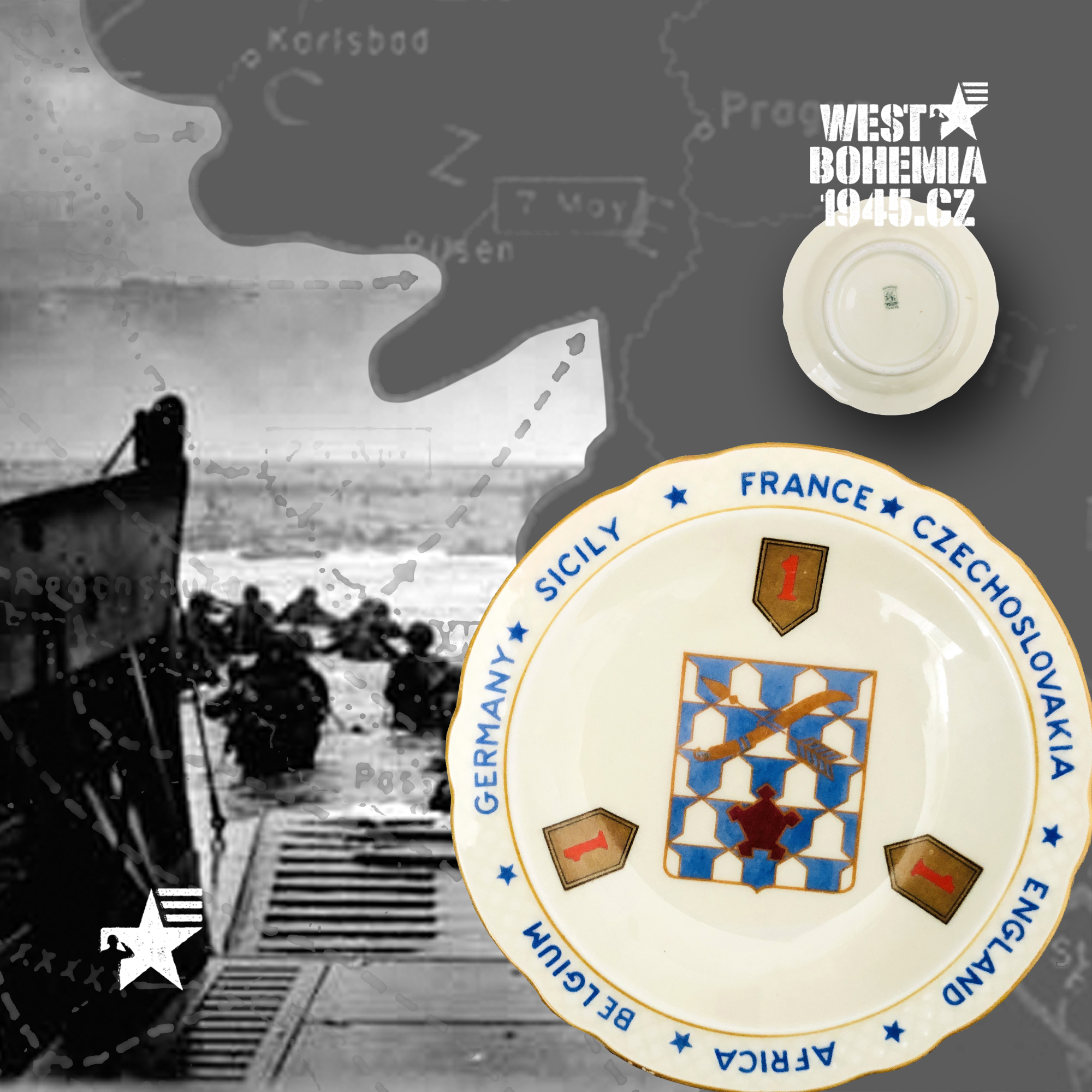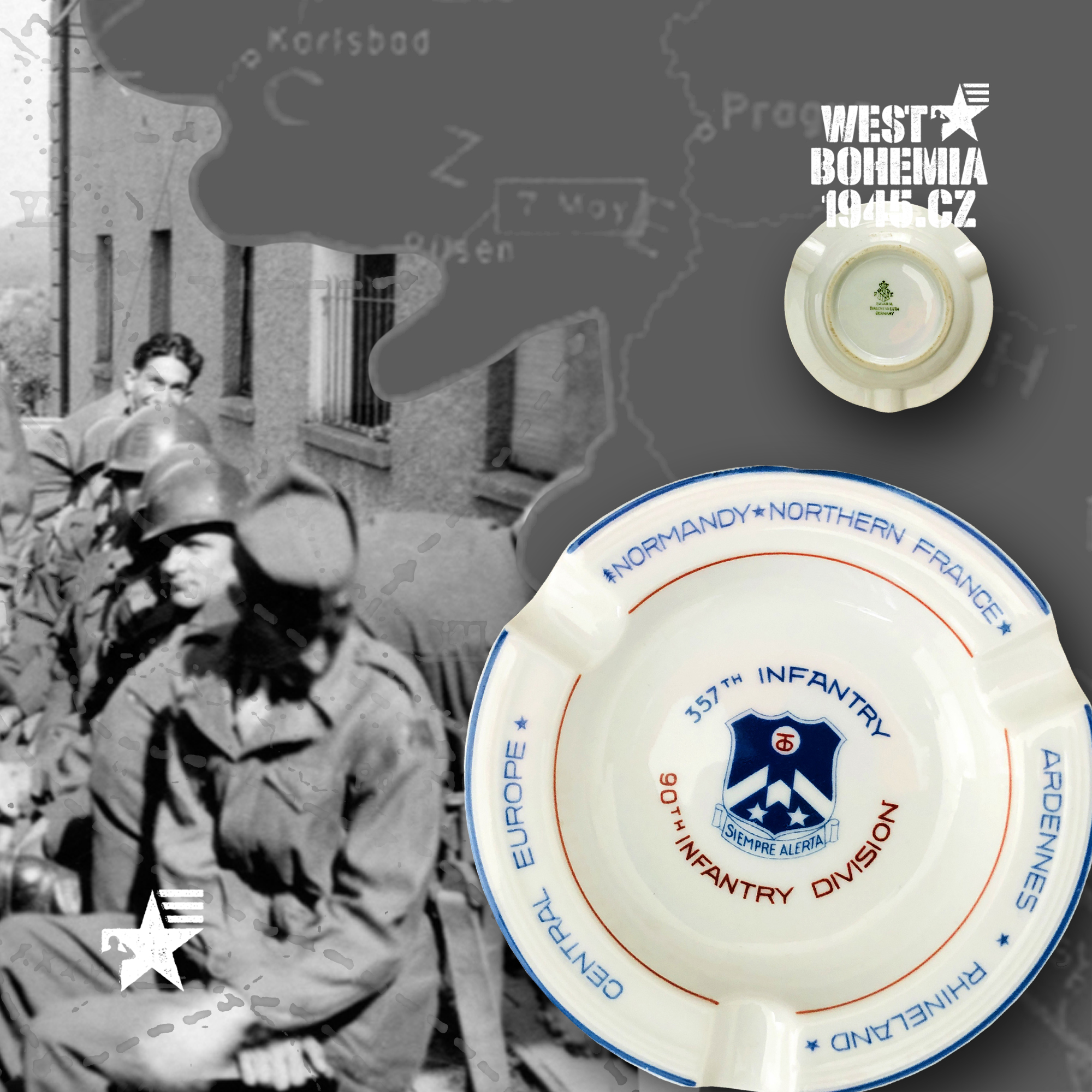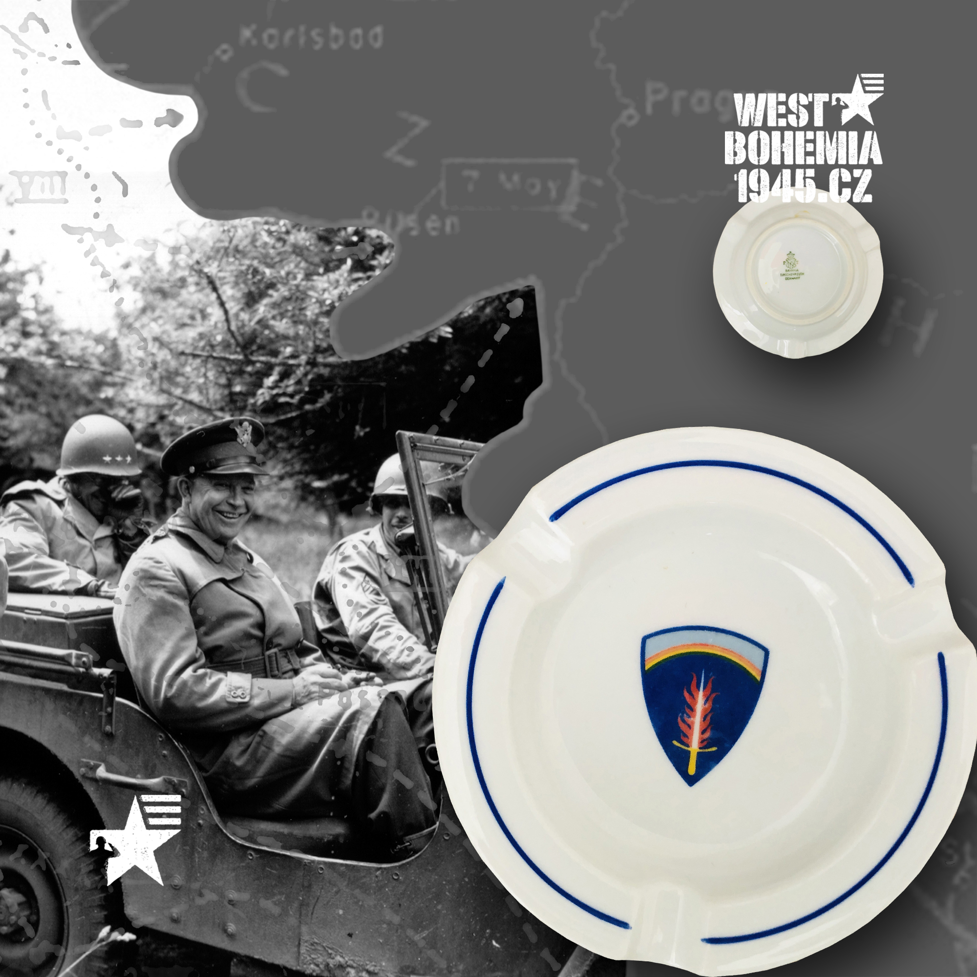 Po osvobození českého západu v dubnu a květnu 1945 mnoho amerických jednotek nepobylo na našem území příliš dlouho a často byly přemístěny do okupační zóny poválečného Německa. Souběžně s výhradně českými suvenýry a upomínkovými předměty 1945 mě zaujaly na mezinárodních aukcích eBay.com před lety i porcelánové popelníky, talířky a pivní korbely vyrobené v sousedním Bavorsku se znaky amerických pluků, praporů, divizí, sborů aj., které se podílely se na osvobození řady měst a obcí v západních a jihozápadních Čechách v dubnu a květnu 1945. Podařilo se mi získat celkem i unikátní kusy jako např. 12. skupinu armád generála Omara Bradleye, jednotky 1. a 90. pěší divize nebo 4. a 9. obrněné divize, nejsou to však zdaleka všechny a na některých najdete i název "CZECHOSLOVAKIA". Německo je proslulé tradiční výrobou "bílého zlata" dodnes a američtí vojáci po válce si kupovali na cestu domů mnoho těchto suvenýrů, často jako vzpomínku na jejich vojenskou okupační službu v Bavorsku 1945. Při bližším hledání se pak nejčastěji setkáte se značkami bavorských porcelánek jako např. "BAVARIA SCHUMANN" (WIESBADEN), "BAUSCHER WEIDEN", "P. T. TIRSCHENREUTH", "PMR JAEGER & CO GERMANY US ZONE", "THOMAS IVORY" a nebo také velmi známý a vyhledávaný "ROSENTHAL SELB-GERMANY".