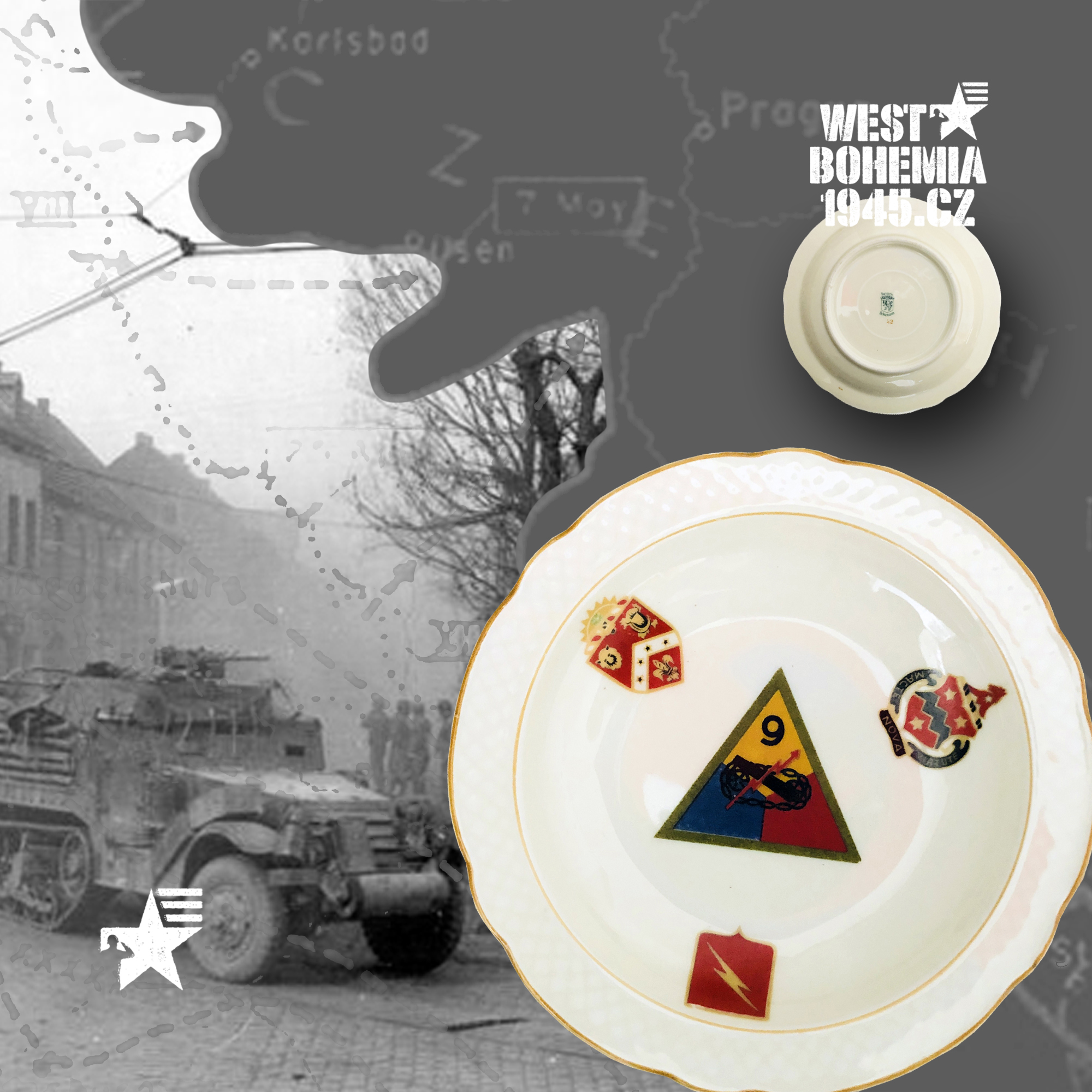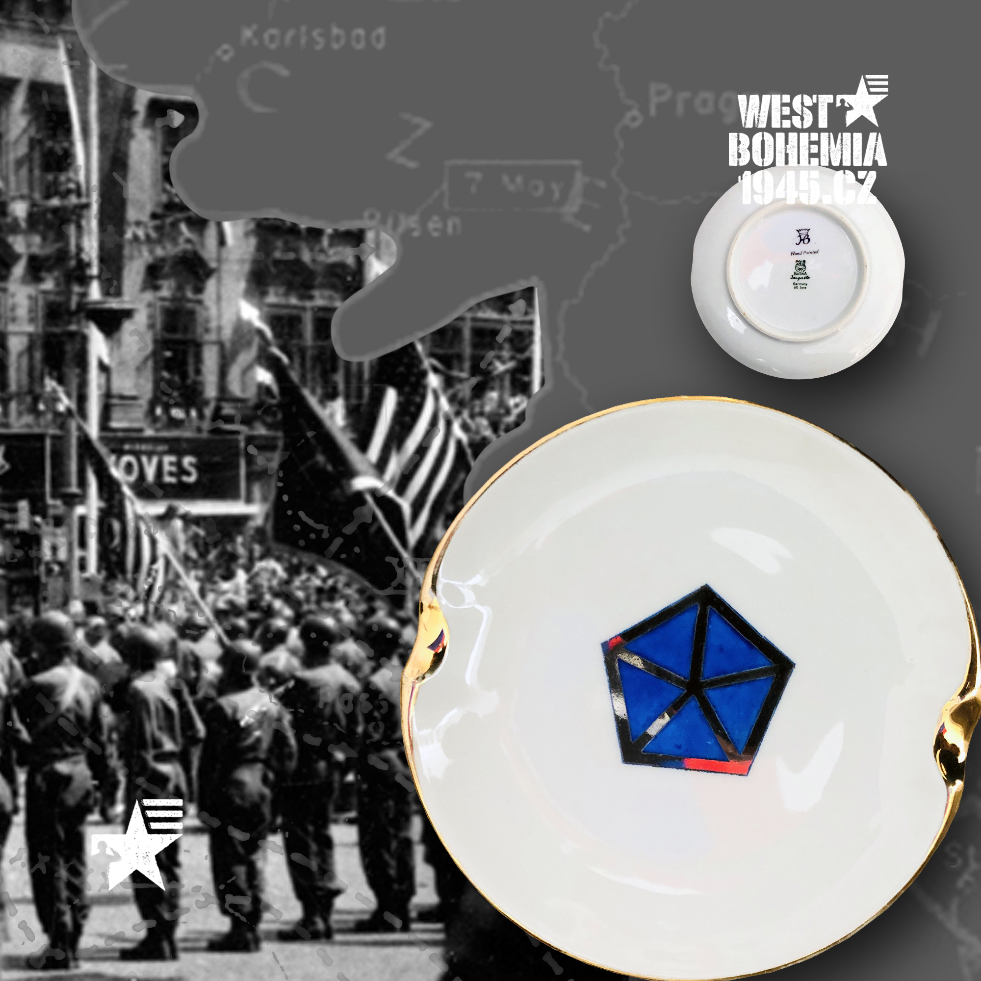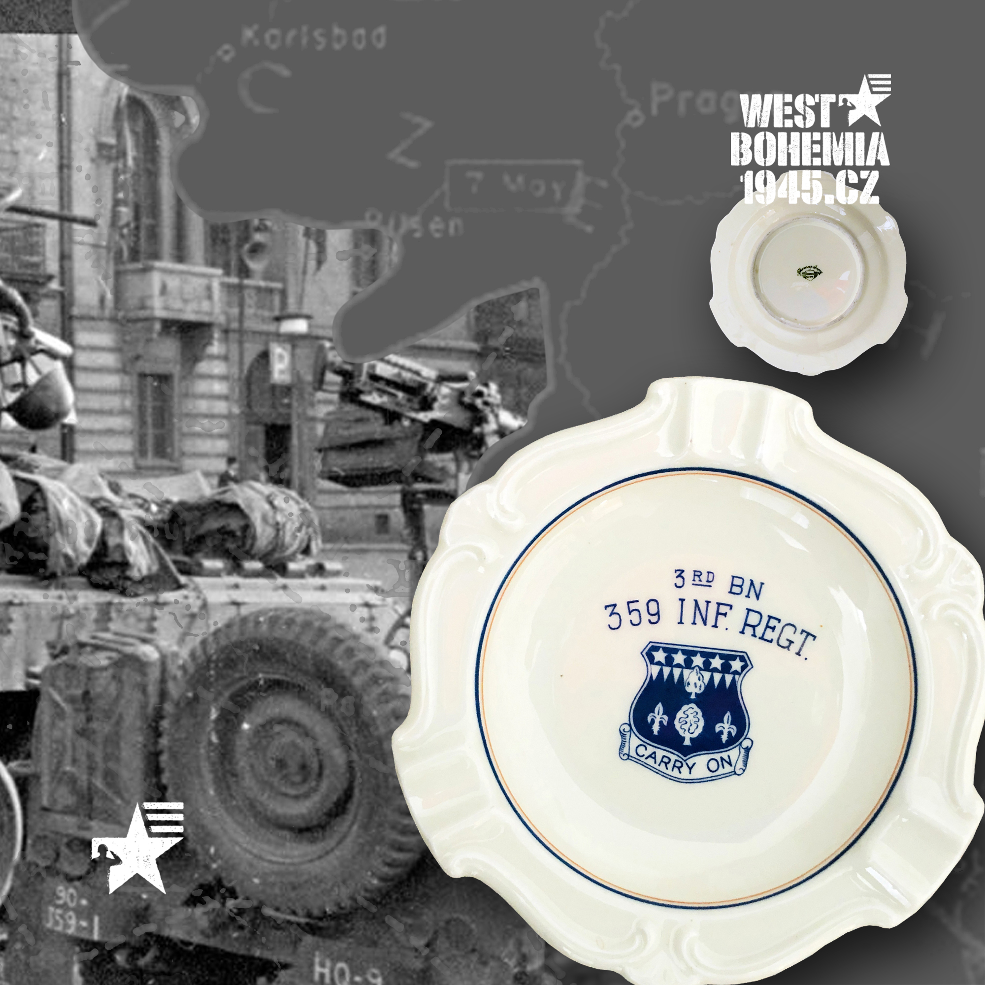 Po osvobození českého západu v dubnu a květnu 1945 mnoho amerických jednotek nepobylo na našem území příliš dlouho a často byly přemístěny do okupační zóny poválečného Německa. Souběžně s výhradně českými suvenýry a upomínkovými předměty 1945 mě zaujaly na mezinárodních aukcích eBay.com před lety i porcelánové popelníky, talířky a pivní korbely vyrobené v sousedním Bavorsku se znaky amerických pluků, praporů, divizí, sborů aj., které se podílely se na osvobození řady měst a obcí v západních a jihozápadních Čechách v dubnu a květnu 1945. Podařilo se mi získat celkem i unikátní kusy jako např. 12. skupinu armád generála Omara Bradleye, jednotky 1. a 90. pěší divize nebo 4. a 9. obrněné divize, nejsou to však zdaleka všechny a na některých najdete i název "CZECHOSLOVAKIA". Německo je proslulé tradiční výrobou "bílého zlata" dodnes a američtí vojáci po válce si kupovali na cestu domů mnoho těchto suvenýrů, často jako vzpomínku na jejich vojenskou okupační službu v Bavorsku 1945. Při bližším hledání se pak nejčastěji setkáte se značkami bavorských porcelánek jako např. "BAVARIA SCHUMANN" (WIESBADEN), "BAUSCHER WEIDEN", "P. T. TIRSCHENREUTH", "PMR JAEGER & CO GERMANY US ZONE", "THOMAS IVORY" a nebo také velmi známý a vyhledávaný "ROSENTHAL SELB-GERMANY".