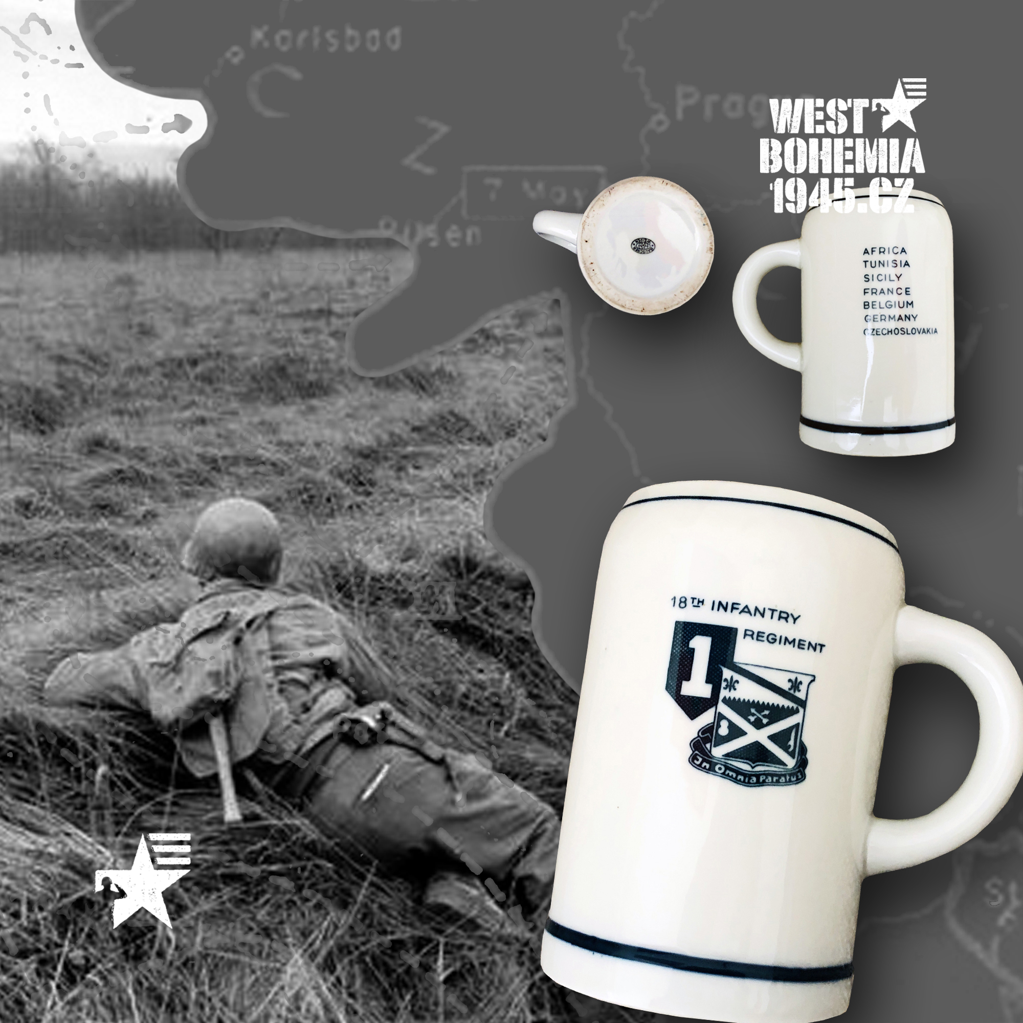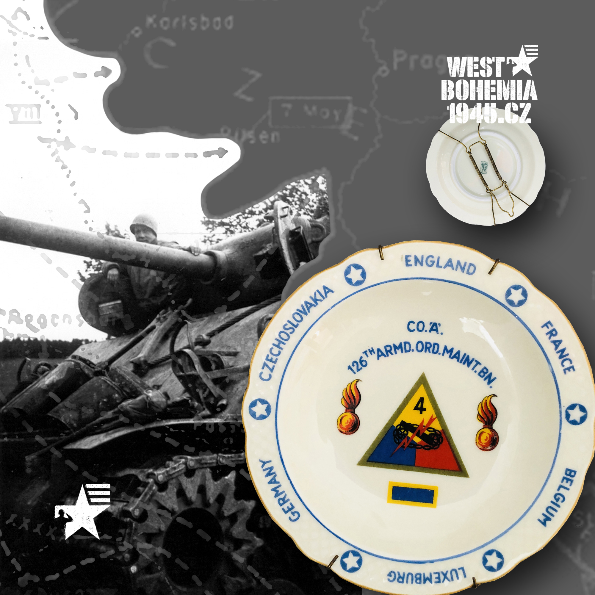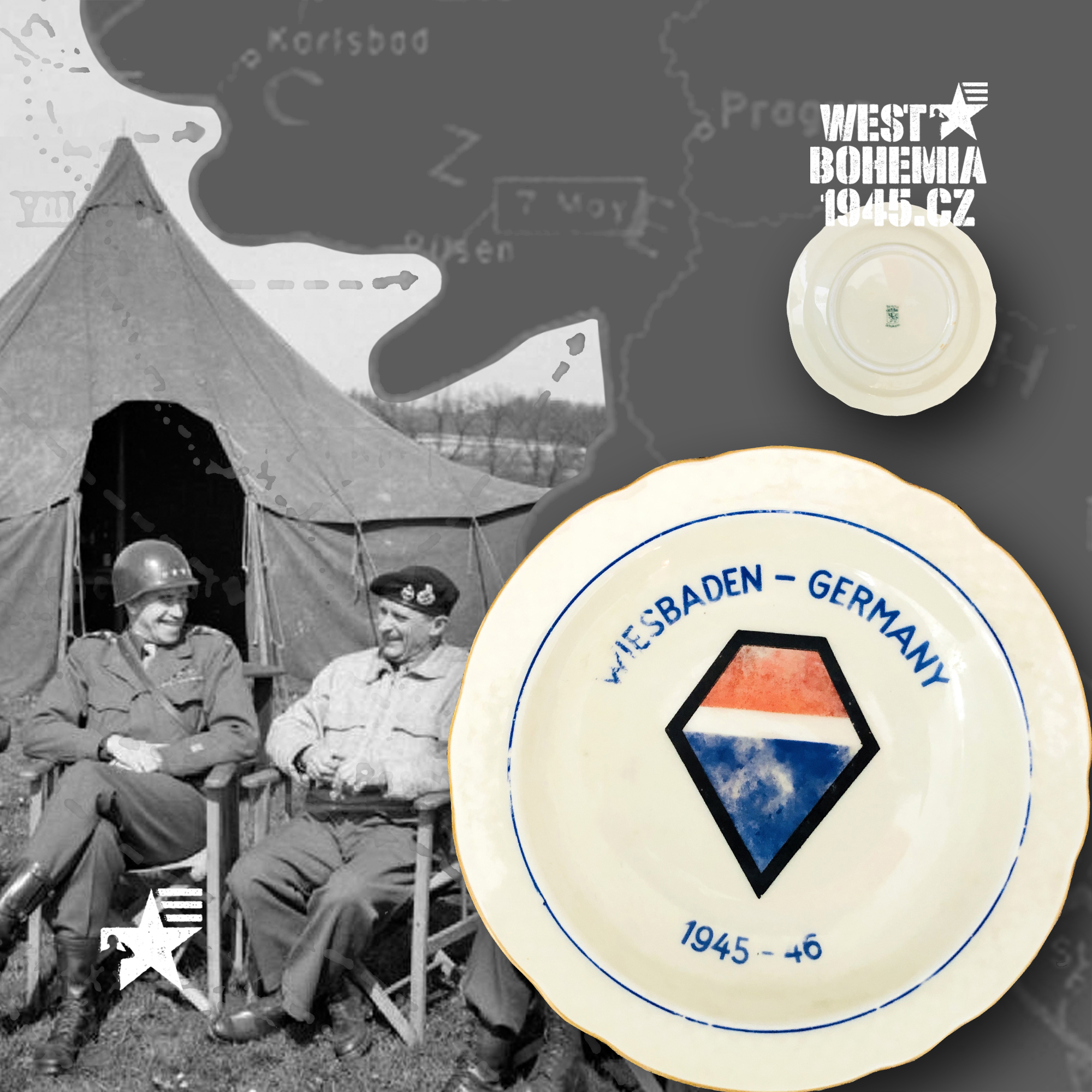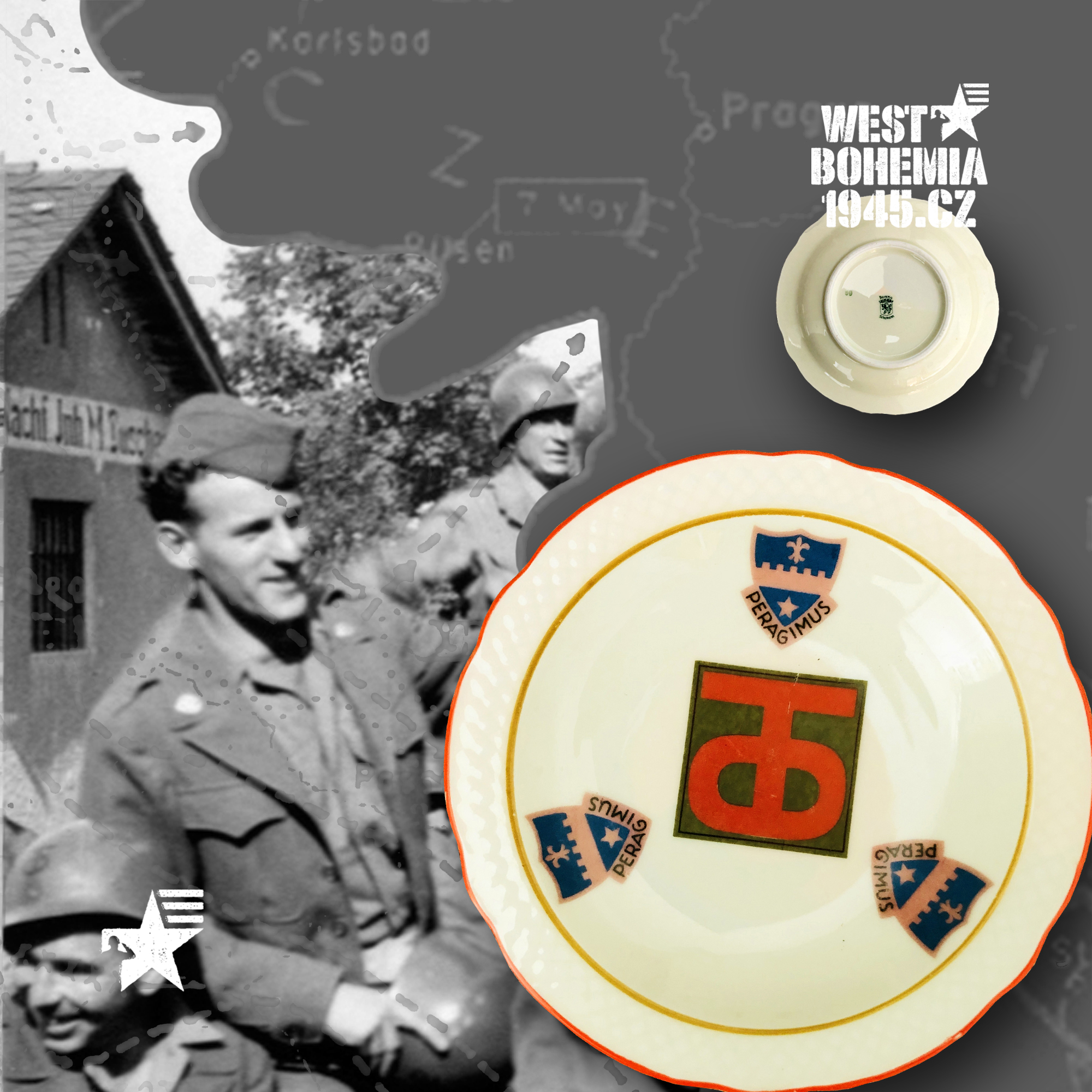 Po osvobození českého západu v dubnu a květnu 1945 mnoho amerických jednotek nepobylo na našem území příliš dlouho a často byly přemístěny do okupační zóny poválečného Německa. Souběžně s výhradně českými suvenýry a upomínkovými předměty 1945 mě zaujaly na mezinárodních aukcích eBay.com před lety i porcelánové popelníky, talířky a pivní korbely vyrobené v sousedním Bavorsku se znaky amerických pluků, praporů, divizí, sborů aj., které se podílely se na osvobození řady měst a obcí v západních a jihozápadních Čechách v dubnu a květnu 1945. Podařilo se mi získat celkem i unikátní kusy jako např. 12. skupinu armád generála Omara Bradleye, jednotky 1. a 90. pěší divize nebo 4. a 9. obrněné divize, nejsou to však zdaleka všechny a na některých najdete i název "CZECHOSLOVAKIA". Německo je proslulé tradiční výrobou "bílého zlata" dodnes a američtí vojáci po válce si kupovali na cestu domů mnoho těchto suvenýrů, často jako vzpomínku na jejich vojenskou okupační službu v Bavorsku 1945. Při bližším hledání se pak nejčastěji setkáte se značkami bavorských porcelánek jako např. "BAVARIA SCHUMANN" (WIESBADEN), "BAUSCHER WEIDEN", "P. T. TIRSCHENREUTH", "PMR JAEGER & CO GERMANY US ZONE", "THOMAS IVORY" a nebo také velmi známý a vyhledávaný "ROSENTHAL SELB-GERMANY".