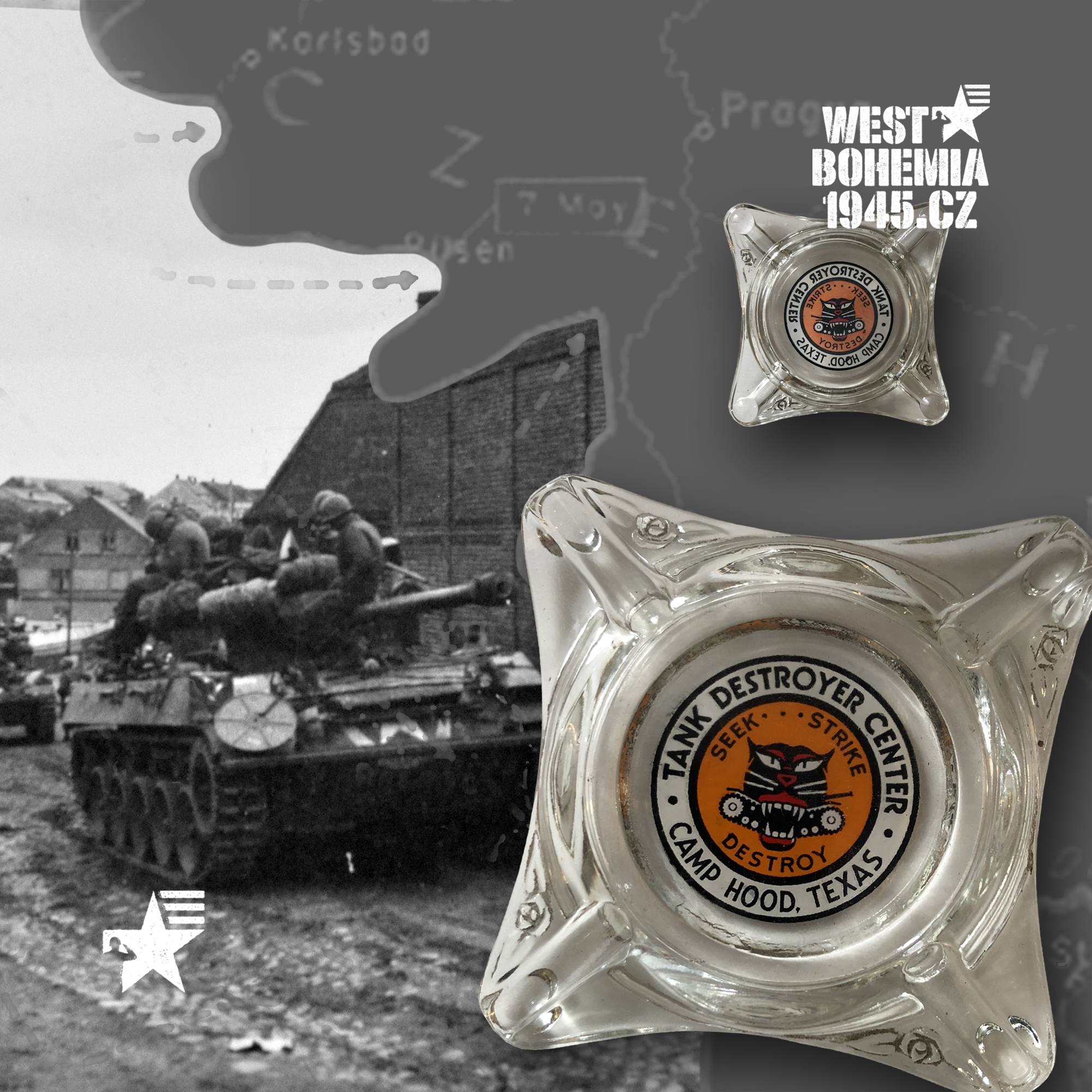 Armáda USA počátkem 40. let sledovala rychlé a překvapivé německé útoky obrněných vozidel na začátku války na evropském bojišti a v první polovině roku 1941 již organizovala v různých formách první nezávislé jednotky, které by byly schopné reagovat na podobné tankové útoky především rychlým protiúderem a vysokou schopností zničit pancéřové zbraně nepřítele. Zpočátku byly tyto jednotky vyzbrojené protitankovými a samohybnými děly, vznikající samostatné protitankové jednotky byly pak postupně vyzbrojeny obrněnými vozidly M20, stíhačem tanků M10 Wolverin nebo M18 Hellcat a případně tanky M36 Jackson. Na bojištích pak měly být přiřazeny k brigádám, sborům a armádám, v praxi však byly dle potřeby součástí pěších divizí. Známým výcvikovým centrem amerických samostatných protitankových jednotek "US Tank Destroyer Units" byl také Camp Hood ve státě Texas a odtud pochází mnoho suvenýrů stejně jako i tento skleněný popelník s důrazným heslem "Seek, Strike and Destroy" (vyhledej, udeř a znič), který jsem vydražil na aukci eBay v roce 2011. Charakteristickým rukávovým znakem příslušníků "Tank Destroyer" je černý panter drtící svými čelistmi tank na podkladu v barvách zobrazujících sílu, oranžové a černé. Během 2. světové války se do bojů zapojila větší polovina z více než sta vycvičených protitankových jednotek. Nášivka "Tank Destroyer" u nás bývá také často a mylně považována za belgickou, důvod je ale prostý. Belgický 17. střelecký prapor složený z dobrovolníků a příslušníků belgického protinacistického odboje byl po výcviku zařazen k "3rd Tank Destroyer Group" a stal se tak součástí V. amerického sboru 1. americké armády, který v závěru války podpořil 3. americkou armádu gen. George S. Pattona jr. při útoku na Československo dne 5. května 1945.