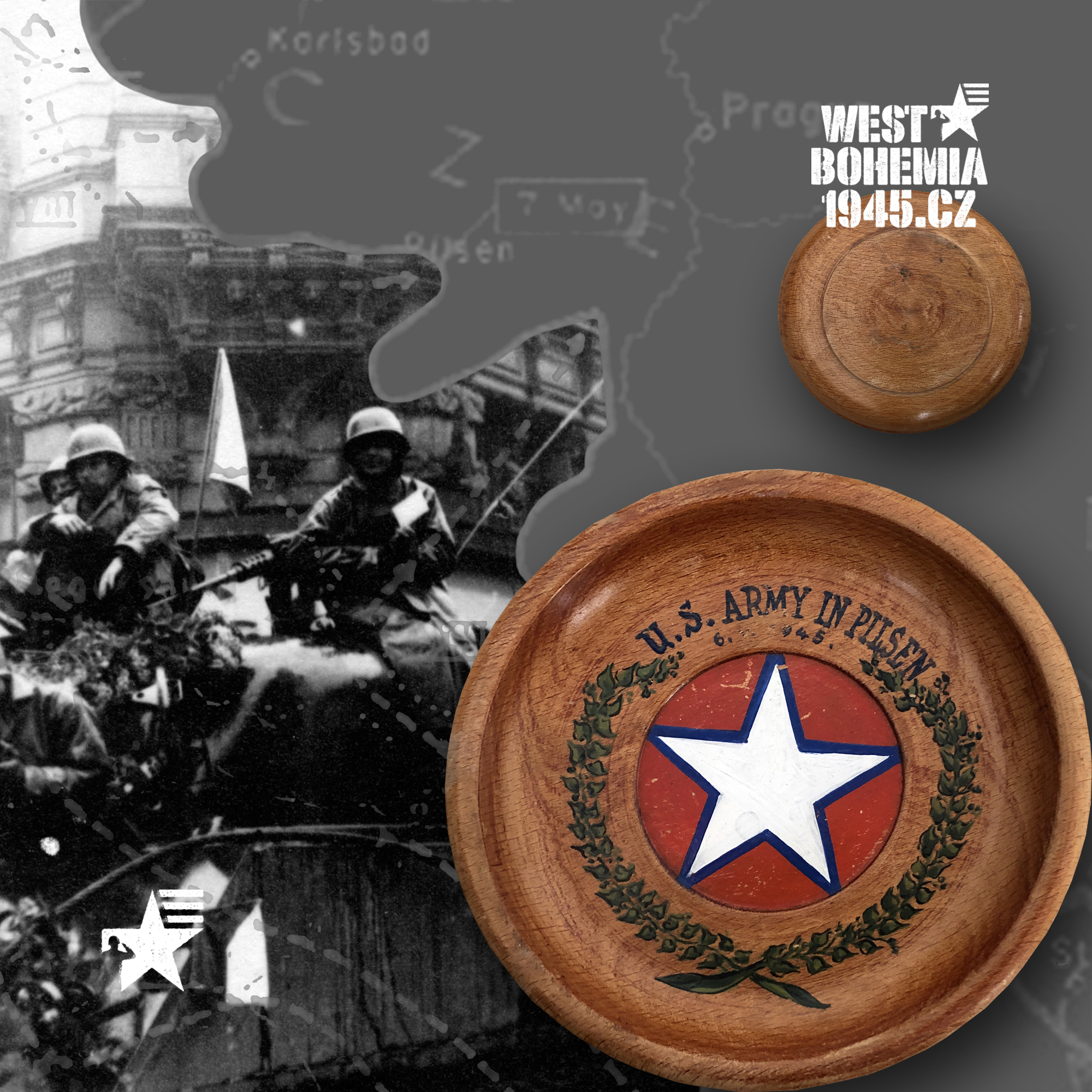 Je docela těžké najít upomínkový předmět týkající se jen osvobození Plzně, který by byl datovaný i památným dnem 6. května 1945, kdy do centra města na náměstí Republiky po 8. hodině ranní dorazily první jednotky 16. obrněné divize s muži brigádního generála Johna Leonarda Pierce. Tento dřevěný talířek bez signace výrobce, s bílou spojeneckou hvězdou a s nápisem "U.S. ARMY IN PILSEN" a datem "6. V. 1945" jsem zcela náhodně objevil v červenci roku 2015 ve známém plzeňském obchodě se starožitnostmi ANTIK-MILITARIA, v době, kdy jsem se na vyhledávání podobných suvenýrů více soustředil. Je to vlastně jeden z mála upomínkových předmětů z českého západu 1945, který necestoval po válce v Evropě se šťastným americkým vojákem do zámoří a zůstal v Čechách, tedy konkrétně v Plzni. Tyto dřevěné suvenýry a nejrůznější předměty, talířky, džbány, dřeváky apod. byly vyrobeny převážně pro americké osvoboditele zručnými chodskými i šumavskými řezbáři a malíři.