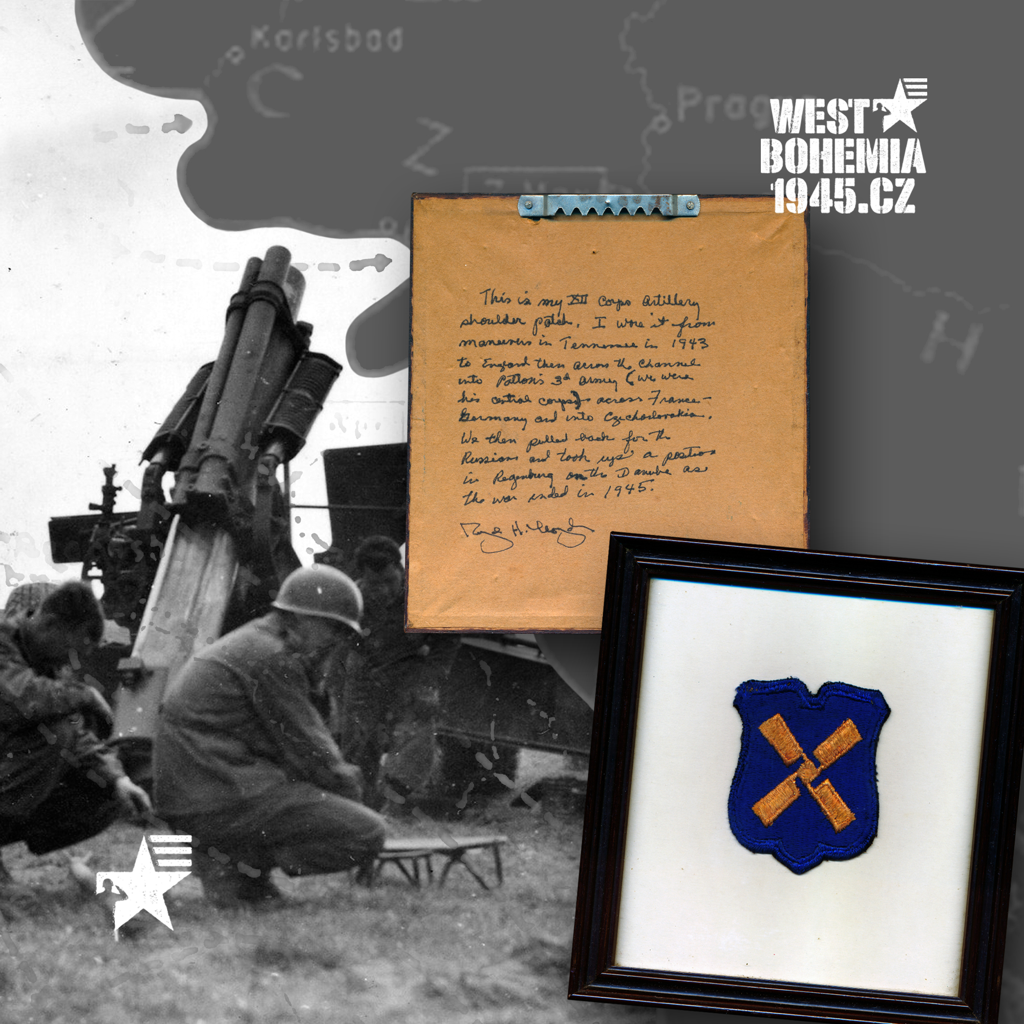 Počátkem roku 2014 jsem na mezinárodní aukci ebay.com objevil zarámovanou rukávovou nášivku amerického XII. sboru, který se podílel jako první na osvobození západních a jihozápadních Čech na přelomu dubna a května roku 1945. Zaujal mě především příběh neznámého amerického vojáka, který si svoji vojenskou službu zajímavě zaznamenal na zadní stranu. Příslušník dělostřelectva amerického XII. sboru (pravděpodobně podepsán R... H. Lloyd) nosil tuto nášivku od manévrů v Tennessee v roce 1943, v Anglii, přes Kanál pak pod 3. americkou armádou generála Pattona (pro něhož byl tento sbor centrálním) ve Francii, v Německu a v Československu. Když válka v roce 1945 skončila, ocitl se s ní následně i v okupační zóně v Regensburgu na Dunaji po stažení jeho sboru od dotykové linie s Rusy. "This is my XII Corps Artillery shoulder patch. I wore it from maneuvers in Tennessee in 1943 to England then across Channel into Patton´s 3d Army (we were his central corps) across France - Germany and into Czechoslovakia. We then pulled back for the Russians and took up a position in Regensburg on the Danube as the war ended in 1945. .."