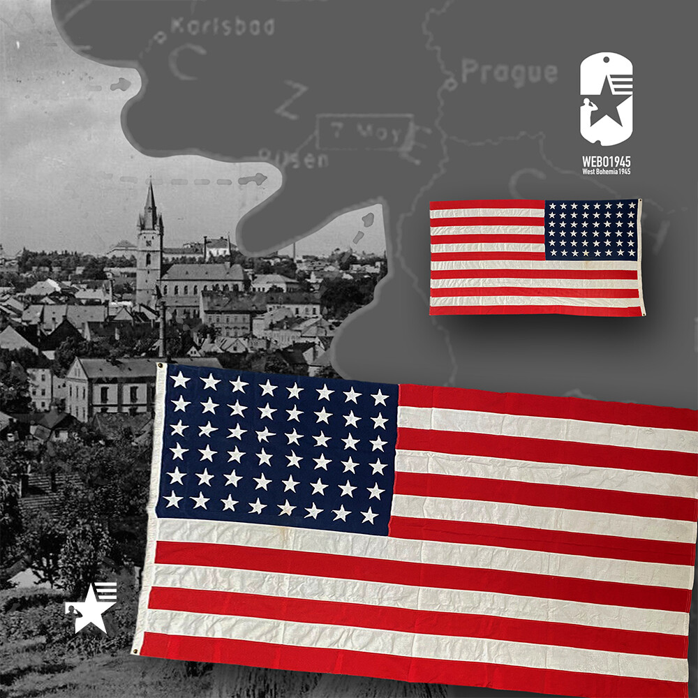Tato americká vlajka byla vyvěšena na radnici města Tachova po osvobození západní části Československa v květnu 1945 a mnoho let ji se sdílením této historie uchovávali a při své klubové činnosti příležitostně používali členové Klubu 3. Armády Plzeň, které znáte jako majitele vojenských historických vozidel z tradičního konvoje Slavností svobody v Plzni nebo z jejich konvoje vítězství po mnoha městech a obcích v jihozápadních Čechách. Vlajka byla například součástí doprovodné výstavy k odhalení pamětní desky 15. polnímu dělostřeleckému praporu 2. pěší divizi na budově obecního úřadu v Losiné, která se konala 7. května 2018 u příležitosti 73. výročí osvobození obce a regionu americkou armádou za přítomnosti amerických veteránů Jamese H. Duncana, Earla Ingrama, George Thompsona a Douga Brackenbrougha. Bavlněná vlajka USA se 48mi hvězdami je ve velmi pěkném stavu a má rozměr cca 150 x 280 cm. Osvobození města Tachova připomíná milník věnovaný 386. pěšímu pluku 97. pěší divize zvané "Trident" a pomník osvobození města Americkou armádou dne 2. května 1945, který je umístěn na okraji parku u Kostela sv. Václava. Pro divizi "Trident" a brigádního generála Miltona B. Halseye se právě Tachov stal 5. května 1945 prvním velitelským stanovištěm na území Československa.